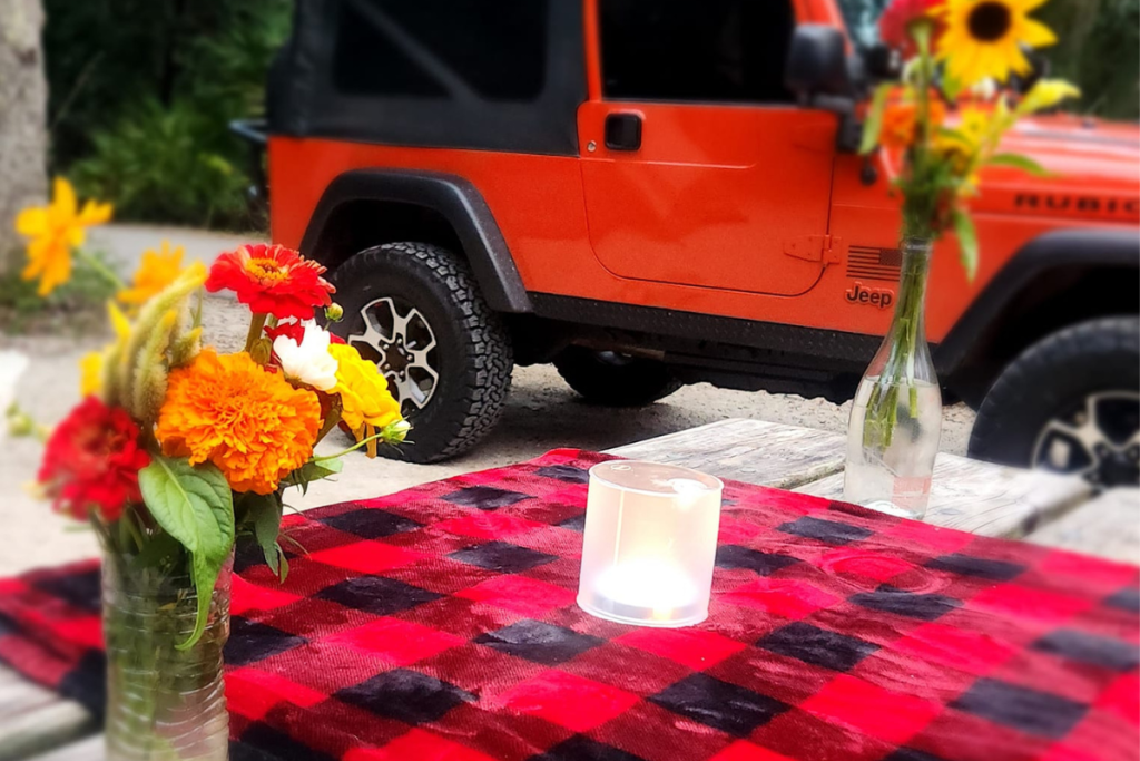A picnic table pulls double duty for prep and eating. The simpler the better!